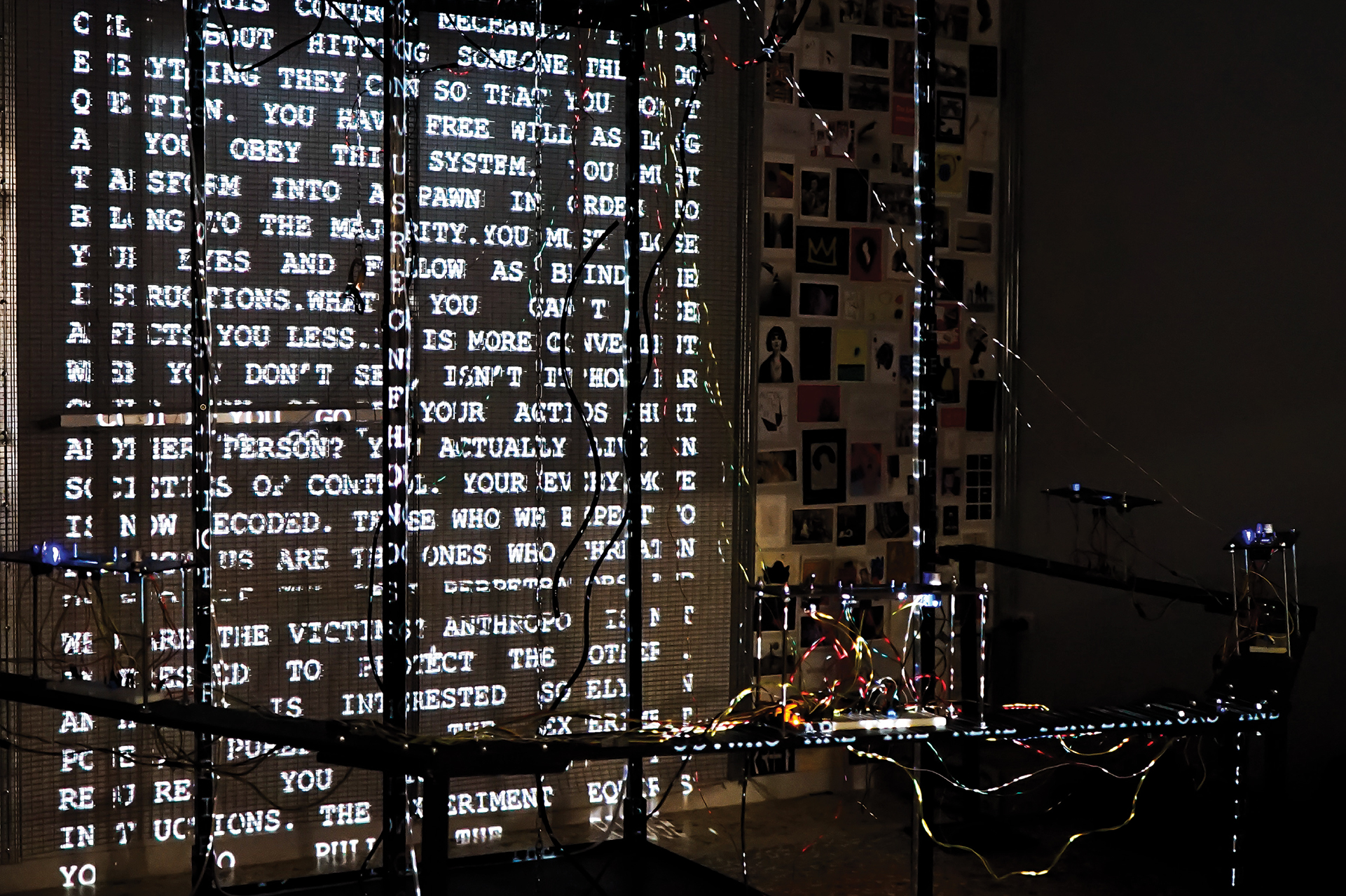 The performer is located in the centre of the installation, inside a translucent box, while the audience surrounds her outside of the box. There are 5 interface points consisting of displays, buttons and switches. Therefore, visitors receive instruction messages by the screen in order to control the performer.