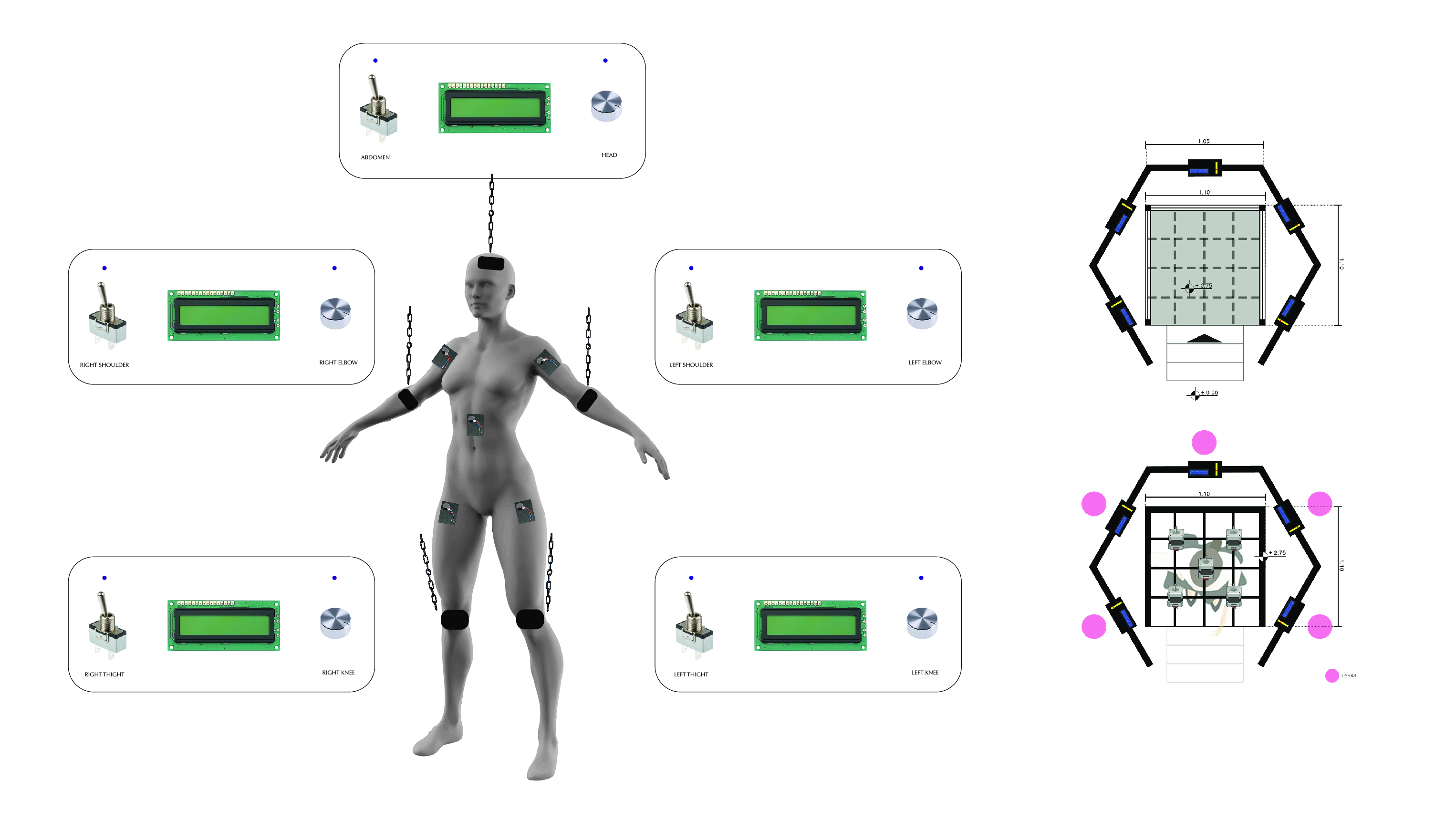 The performer is connected by a series of vertical chains (five in total) which pull in the direction defined by the interaction. Each rope is connected to a stepper motor and a different part of the body (head, elbows, knees). The performer is also connected with 5 vibrators in 5 different parts of her body (abdomen, shoulders and thighs). The perpetrator-participant has a scaled level of control. The more they interact and increase the intensity of the interaction, the more they “harm" the victim-performer. The performer of course does not really hurt but reacts to the scale of the stimuli with more or less intensity for the purposes of the experiment. The more visitors participate, the more control is turning the performer into a puppet.
